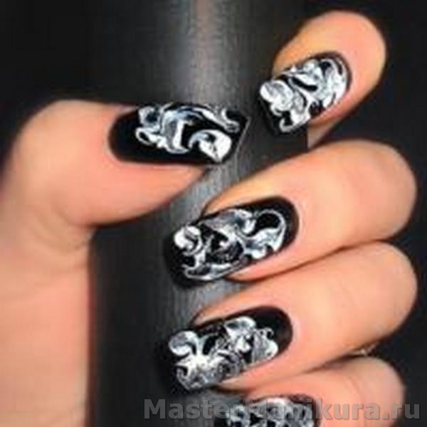 Ввиду разнообразия рисунков, найти подходящий вариант вовсе не сложно. К примеру, мраморный эффект на ноготках – это что-то новое, необычное, но в то же время максимально нейтральное. Но в данном случае многое зависит от сочетания оттенков. Популярностью пользуется черное покрытие с белым рисунком и наоборот. Допустимы и другие оттенки, поэтому каждая модница найдет идеальное для себя решение.