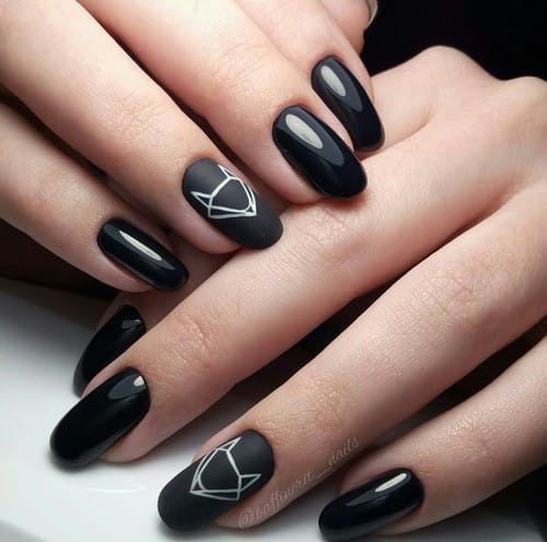 Также отличная идея черного маникюра, в котором одновременно сочетается и глянцевое и матовое покрытие, что создает необычный и красивый эффект на ногтях.