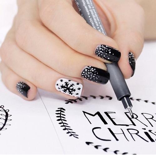 Популярный и беспроигрышный вариант исполнения черного маникюра – это дополнить его лаком белого цвета, что позволит создать стильный маникюр на ваших ручках.