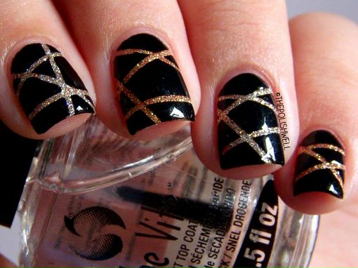 Модный черный маникюр для вечера можно выполнить с золотыми и серебристыми полосками, различными втирками и лаконичными рисунками, которые «оживят» маникюр с черным лаком.
