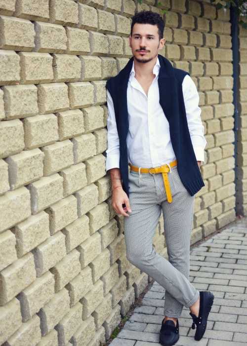 При этом важно соблюдать такое правило: все элементы композиции должны быть выполнены в одном стиле. Если мужчина планирует использовать серые брюки для делового лука, категорически запрещено надевать яркие аксессуары или необычную обувь.