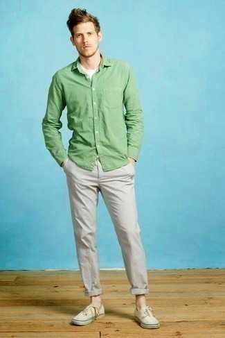 Бежевые низкие кеды из плотной ткани СохранитьУдалитьЗеленая рубашка с длинным рукавом и серые брюки чинос стильно вписываются в гардероб самых избирательных молодых людей. Ты можешь легко приспособить такой ансамбль к повседневным реалиям, закончив его бежевыми низкими кедами из плотной ткани.
