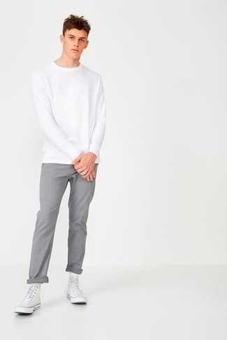Белые высокие кеды из плотной ткани СохранитьУдалитьКомбо из белого свитшота и серых брюк чинос — отличный вариант для воплощения мужского образа в стиле smart casual. Чтобы образ не получился слишком претенциозным, можно закончить его белыми высокими кедами из плотной ткани.