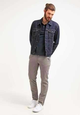 Темно-синяя джинсовая куртка СохранитьУдалитьТемно-синяя джинсовая куртка в сочетании с серыми брюками чинос однозначно будет обращать на себя внимание прекрасных барышень. Ты сможешь легко адаптировать такой лук к повседневным делам, надев белыми низкими кедами.