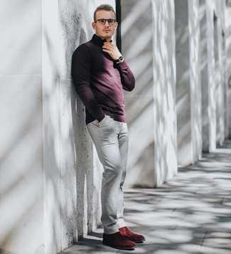 Черные кожаные часы СохранитьУдалитьТемно-красный свитер с воротником на молнии и серые брюки чинос будет замечательным вариантом для простого образа на каждый день. Хочешь добавить сюда толику строгости? Тогда в качестве дополнения к этому луку, выбери темно-красные замшевые ботинки челси.
