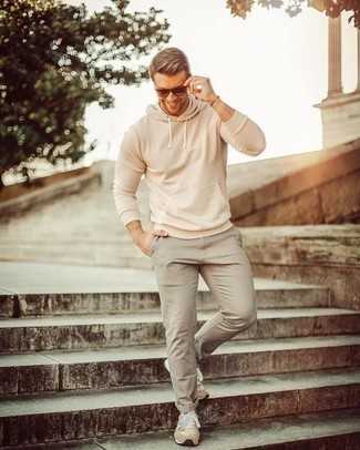 Светло-коричневые замшевые кроссовки СохранитьЕсли ты любишь одеваться стильно, и при этом чувствовать себя комфортно и нескованно, стоит опробировать это сочетание бежевого худи и серых брюк чинос. Дополнив лук светло-коричневыми замшевыми кроссовками, ты привнесешь в него динамичность.