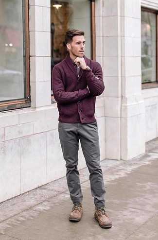 Темно-красная рубашка с длинным рукавом в мелкую клетку СохранитьУдалитьПурпурный кардиган с отложным воротником и серые брюки чинос — неотъемлемые вещи в арсенале молодых людей с великолепным чувством стиля. Коричневые кожаные повседневные ботинки становятся великолепным завершением твоего ансамбля.