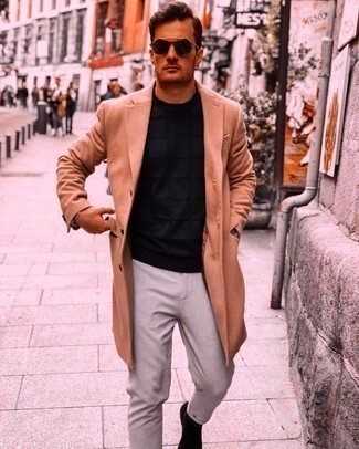 Черные замшевые ботинки челси СохранитьУдалитьСветло-коричневое длинное пальто и серые брюки чинос — прекрасный выбор для офисного образа на каждый день. Дополнив ансамбль черными замшевыми ботинками челси, можно получить занятный результат.