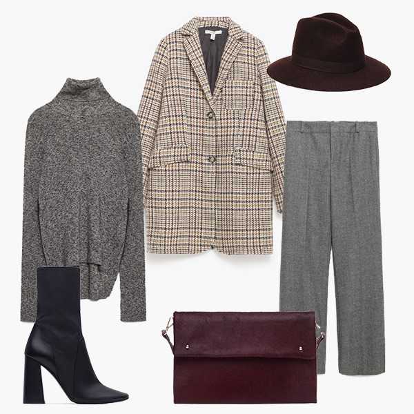 Яркий пример современной классики – это комбо минималистичной водолазки, клетчатого пальто, серых брюк прямого покроя, ботильон на устойчивом каблуке и, конечно же шляпы. Просто и с потрясающим вкусом!