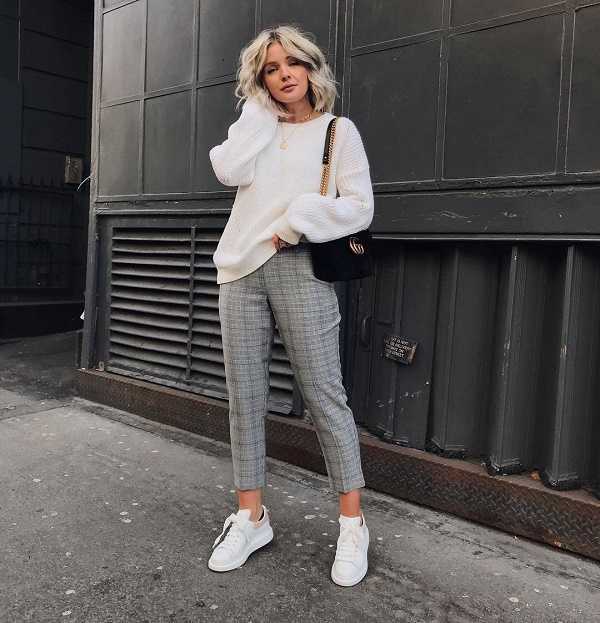 Образы на фотографиях подскажут вам, что серые брюки всегда создают идеальный образ с белой блузой или рубашкой. Совершенно неважно, какой фасон вы предпочтете – лаконичный или, быть может, с бантом на шее – вы в любом случае будете на высоте.