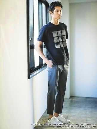 Белые кожаные низкие кеды СохранитьУдалитьНесмотря на свою легкость, лук из черно-белой футболки с круглым вырезом с принтом и серых брюк чинос приходится по душе стильным молодым людям, покоряя при этом дамские сердца. Белые кожаные низкие кеды неплохо дополнят этот ансамбль.