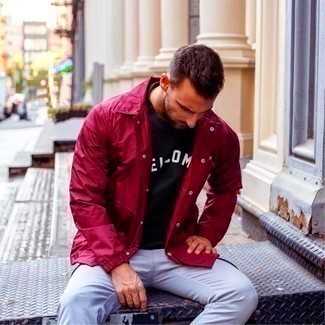 Серые брюки чинос Несмотря на свою несложность, дуэт темно-красной ветровки и серых брюк чинос приходится по вкусу стильным молодым людям, неизбежно покоряя при этом дамские сердца.