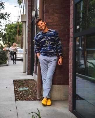 Желтые замшевые лоферы СохранитьУдалитьСочетание темно-синего свитера с круглым вырезом с камуфляжным принтом и серых брюк чинос в мужском ансамбле позволит создать ощущение «элегантной свободы». Хотел бы сделать ансамбль немного элегантнее? Тогда в качестве обуви к этому образу, стоит выбрать желтые замшевые лоферы.