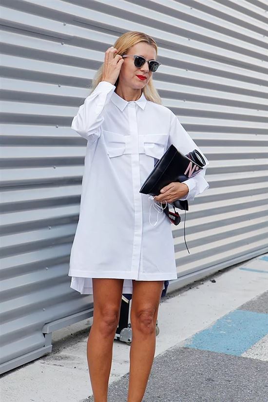 Сочетание платья-рубашки с джинсами — из необычных, в духе уличной моды — не каждой девушке придет в голову надеть под платье брюки. Но этот вариант все же имеет право на существование. Кристин Сентенера – редактор австралийского Vogue, даже рубашку макси длиной практически в пол комбинирует с джинсами и выглядит очень элегантно.