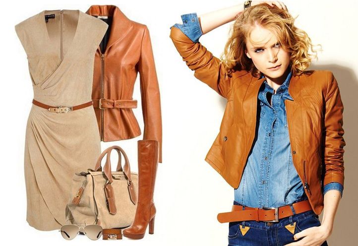 Первый возможный вариант – это сочетание кожаной куртки рыжего цвета с трикотажным платьем. Это вариант уже для более холодной осени, когда хочется быть в тепле и все равно оставаться красивой и женственной.