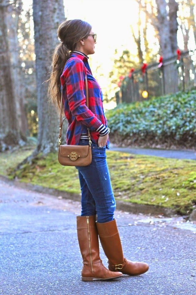 На случай совсем теплой погоды, имейте в виду, что oversize рубашки в клетку сочетаются с рыжими сапогами ничуть не хуже.