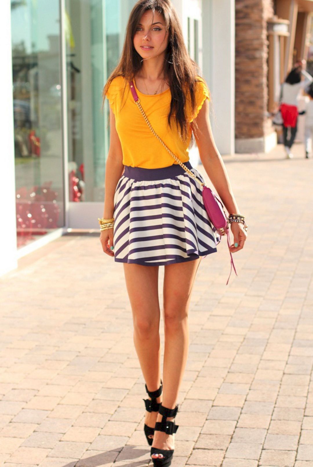 Итак, с чем носить юбку «солнышко»? Для начала нужно определиться с цветом. Если у вас юбка бордового, бирюзового или кораллового цвета, то лучше сочетать ее с однотонными белыми футболками или футболками без надписей. Во-вторых, если это, наоборот, спокойный нежный оттенок, смело можно надевать яркий топ и дополнять ансамбль модными аксессуарами или украшениями.