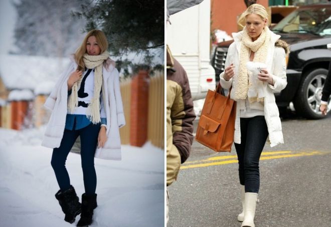 На самом деле, как уже было сказано, дутики являются весьма универсальной обувью. Конечно, с нарядным платьем их ни в коем случае надевать не рекомендуется, но вот в качестве повседневной обуви они просто идеальны. Дутики отлично подойдут к джинсам, но даже с деловым костюмом они могут хорошо смотреться. Удобно также и то, что в высокие белые дутики можно заправить брюки, чтобы не заляпать их, если на улице дождь. Если говорить о верхней одежде, то дутики подойдут как к пуховикам, так и к классическим шерстяным пальто, главное правильно подобрать акценты.