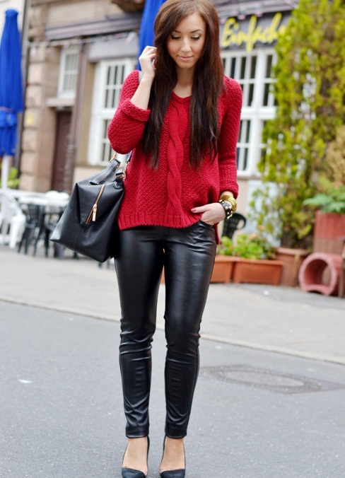 Не менее стильным выглядит тандем красной водолазки с бархатными леггинсами.