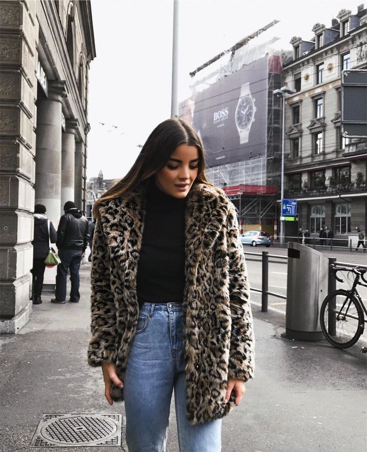 Смело носите леопардовую шубу с простыми вещами, такими как обычные джинсы и грубые ботинки.