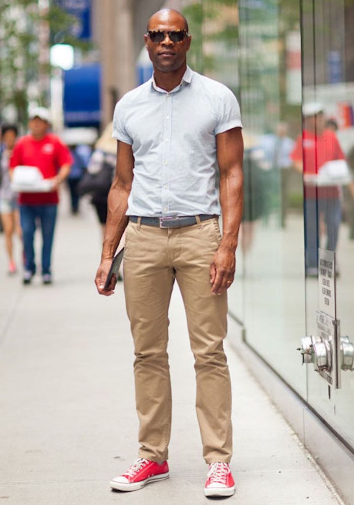 Ключ к удачному сочетанию кроссовок и брюк чинос — правильно подобрать брюки. Выбирайте брюки чинос без заломов на штанинах или дайте им чистые манжеты на кромке. Также важно выбрать оригинальные кроссовки. Оставьте свои любимые кроссовки на выходные или в нерабочее время. Эти туфли по своей природе носят повседневный характер, но носить их с брюками чинос — неожиданный способ улучшить свой образ. Осмелитесь попробовать?