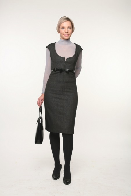 Сарафан-футляр длиной до колена идеально подойдет для офисной капсулы. На основе этой модели создают консервативные образы, которые идеальны для деловых встреч и важных переговоров. Такой аутфит смотрится весьма лаконично. Сарафан из кожи великолепно комбинируется с тонкими водолазками, теплыми шерстяными джемперами, кардиганами и офисными блузками.
