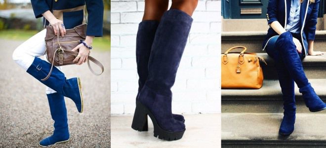 Для тех, кто отдаёт предпочтение городскому стилю, также подойдут синие сапоги. Правильно подобрав замшевую обувь, крупную сумку под неё, тёмные леггинсы и свободную кофточку, вы будете приятно выделяться на фоне городской серости.