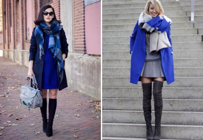 Популярный вариант – носить ботфорты с мини-юбками или теплыми шортами. Женственность луку придаст объединение жемчужно-серого вязаного платья и голубых ботфортов.