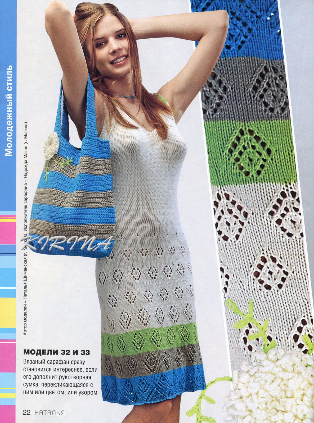 Введите в основное полотно сарафана вязаную полоску из нити с блестками, бахромой или цветных ленточек, добавьте тонкую люрексную нить — ваше изделие ничуть не уступит ультрамодным вязаным сарафанам с современных показов мод. Или дополните вязаное полотно вышитыми элементами, включив стразы и бисер – вы получите оригинальный сарафан. Тем более в двойне приятно — ведь он выполнен целиком вашими руками.