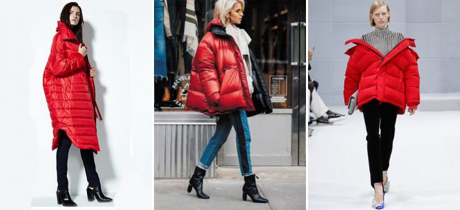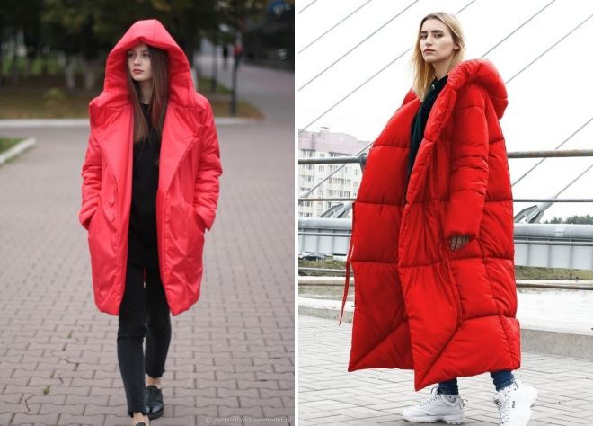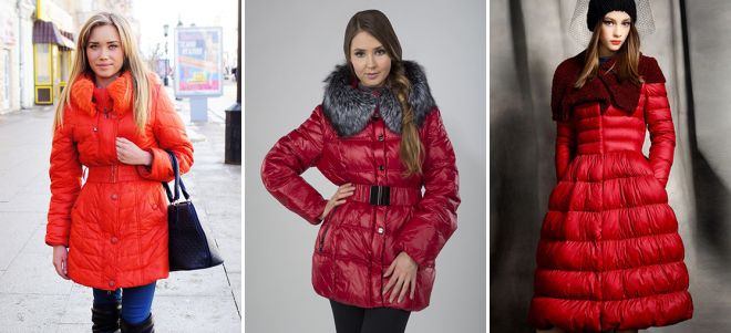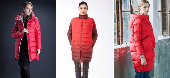 Пуховики красного цвета и принтованный низ