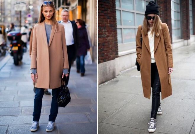 - Песочные тона. Оттенки camel идеально подходят для пальто и никогда не выходят из моды. И можно не ломать голову, с чем носить бежевое пальто — такая верхняя одежда подходит практически ко всему.