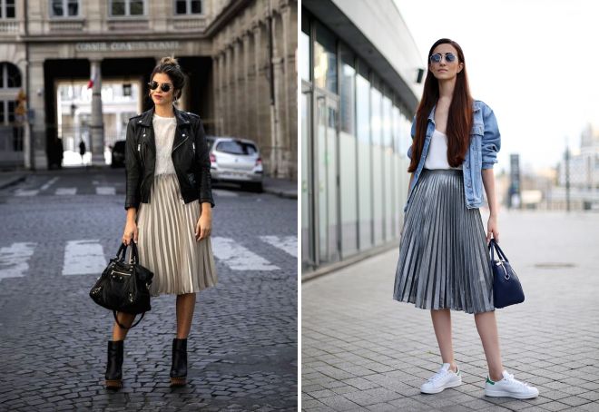 Стилисты рекомендую сочетать длину миди с высокими сапогами и ботфортами, и не переживать о том, что ботильоны могут визуально укоротить ноги. Казаки тоже пойдут, если они высокие. Кроме этого, плиссированные юбки можно дополнять с кроссовками, кедами, составляя образ в стиле спортивный шик. Отличная идея носить легкую юбку с грубой обувью и кожаной курткой.