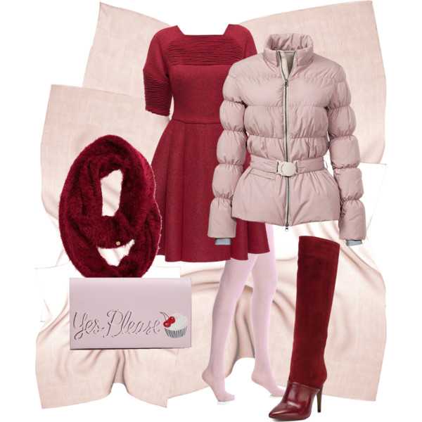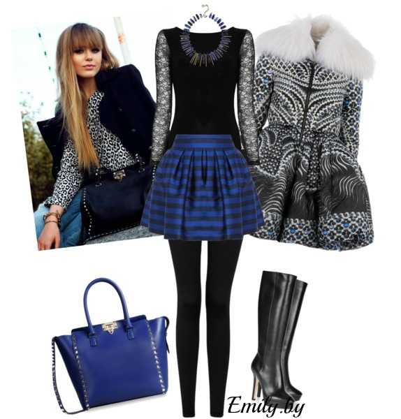 Еще вариант, как и с чем носить пуховики? Я советую не бояться и носить зимой юбочки, ведь это так мило и женственно! Подойдет почти любой пуховик, единственное исключение – спортивная пуховая куртка. К комплекту дутая куртка плюс юбка, важно правильно подобрать колготы. Они должны быть с большим количеством Den, плотные, теплые, однотонные или цветные, но ни в коем случае не телесные капроновые! Во-первых, это красиво, а во-вторых, здоровье — прежде всего! С короткой юбкой и пуховиком очень стильно смотрятся высокие сапоги. Фото