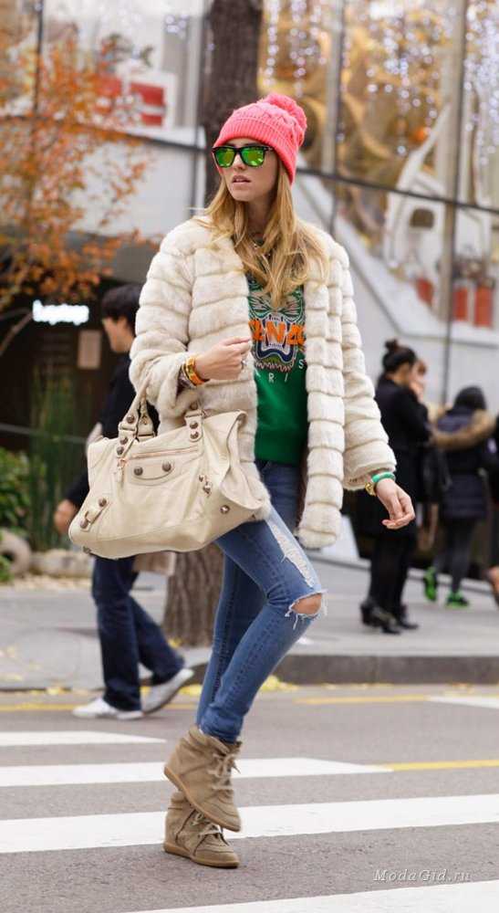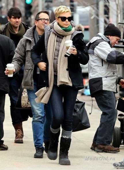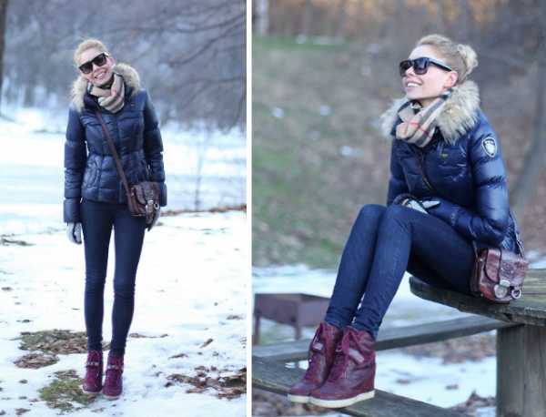 Пуховик можно носить практически с любой обувью в зависимости от его фасона. Мои любимые сочетания — с уггами, дутиками, валенками и ботильонами. Но также его можно носить и с высокими сапогами до колена, ботфортами, и даже резиновыми сапогами. Исключаем только туфли и сапоги-чулки. Обувь на шпильке плюс пуховик носим с осторожностью (не только в переносном, но и прямом смысле, в гололед такая обувь достаточно опасна для здоровья). Пуховик должен смотреться очень женственно и элегантно, чтобы вы могли надеть с ним шпильку.