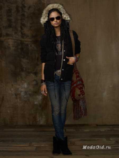 Такой пуховик и узкие джинсы можно дополнить зимними кроссовками, сникерсами, тимберлендами или классическими полуботинками. Кроме того, под узкие джинсы дизайнеры рекомендуют носить любые сапоги или ботфорты с широким голенищем, можно на каблуке, но не на шпильке. Кстати, под пуховик до середины бедра можно также носить угги до колена.