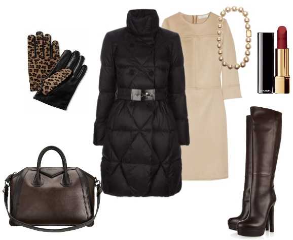 Если пуховик носится с платьями либо юбками, можно включить в ансамбль высокие кожаные сапоги на каблуке. А вот ботфорты не подойдут ни в коем случае.