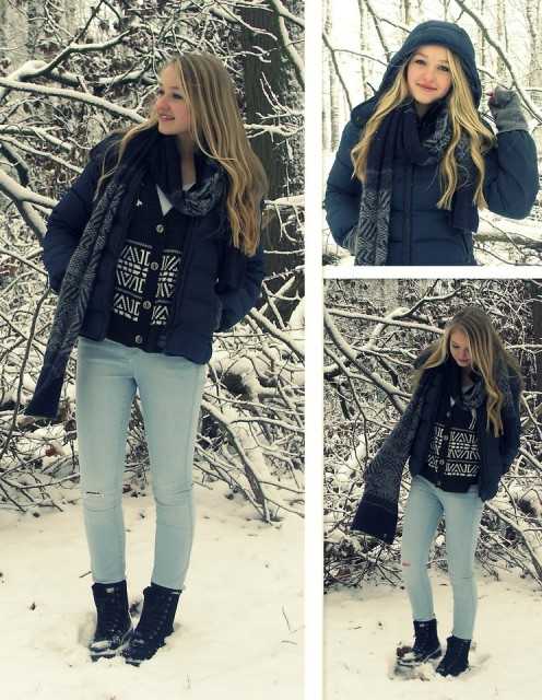 Еще есть вариант сделать из себя с помощью такого пуховика «девушку-соседку», какую изображают обычно в рекламе семейных товаров. Это кэжуал и джинсы, много вязаных вещей, те самые шапки с ушами и варежки, свитерки с оленями и узорами…