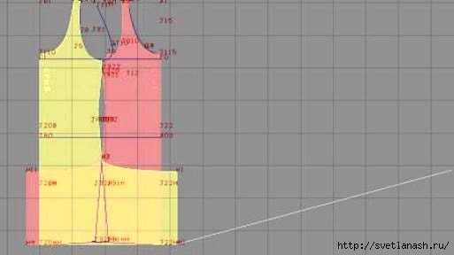 Моделирование голубого платья Уменьшаем клешение платья в боковых швах на 7-8 см по переду и спинке (линии красного цвета на чертеже). Восстанавливаем прямой угол в месте сопряжения бокового среза и низа, выравниваем линию низа. |