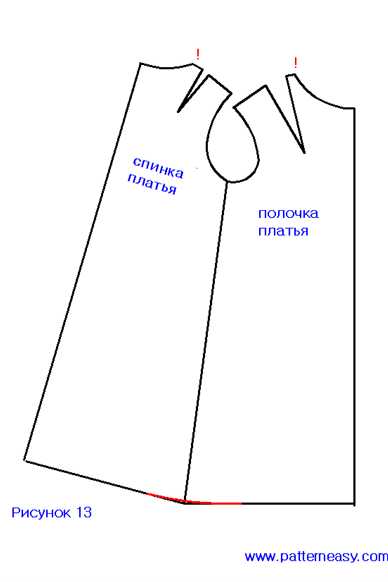 Очень важно, перед раскроем, проверить чтобы все линии полочки и спинки плавно переходили друг в друга!!! На рисунке 13 показана корректировка линии низа. Восклицательным знаком указано место проверки сопряжения выреза «лодочки».