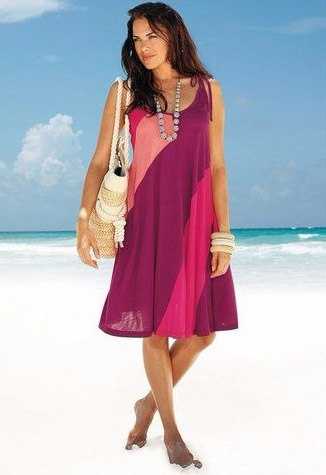 Обрабатывать шов следует по линии плеч и по всей длине изделия. Если ткань сильно осыпается на срезе, то ее нужно обработать на оверлоке. Как видите, сарафан и платье-трапеция, выкройка очень проста, может быть создано всего за полчаса. При этом вы получите уникальное изделие, которое невозможно найти ни в одной дизайнерской коллекции мира! Украсить платье вы можете при помощи броши или других аксессуаров, в зависимости от вашего образа.