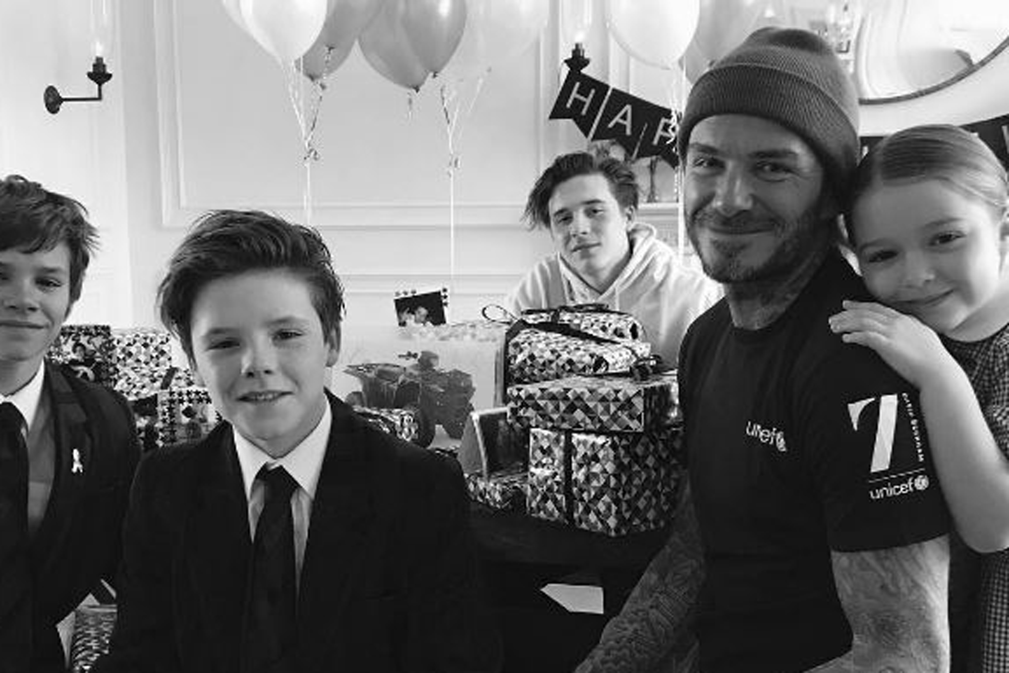 44-летний Дэвид поделился целой серией фото, сделанных в разные годы семейной жизни. Самой последней в «карусели» стала фотография, на которой супруги позируют вместе со своими четырьмя детьми: 20-летним Бруклином, 16-летним Ромео, 14-летним Крузом и семилетней Харпер.