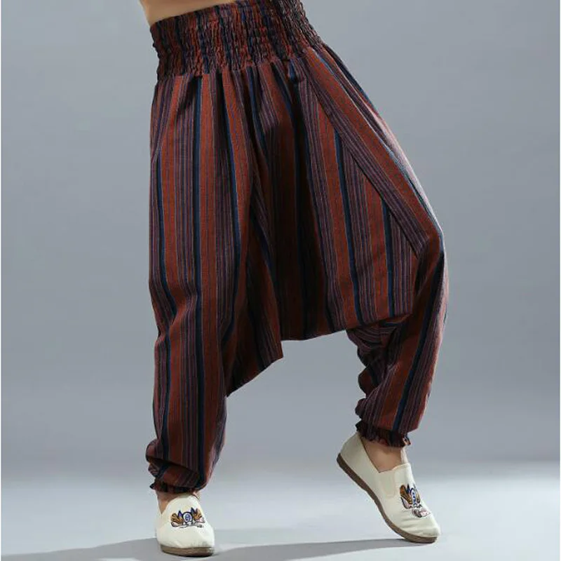 Мужские штаны шаровары с мотней черные льняные с карманами уличный стиль