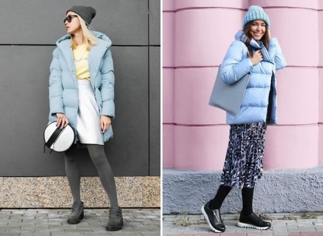 С чем носить нежно голубой пуховик? Невероятно женственное и комфортное пальто на пуховой или синтепоновой подкладке с расклешенным низом – ультрамодный выбор, максимально подходящий под платья и костюмы с юбкой. Если ваш пуховик еще и трансформер, где пышный низ может отстегиваться, то это вообще универсальная верхняя одежда городского шика. С такими вещами гармонично выглядят: