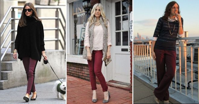 Темно-бордовый цвет брюк всегда привлекает внимание, но первое, на что стоит обратить внимание при выборе – это актуальность модели, ведь несоответствие модным тенденциям может выглядеть абсурдно. Подобрать верх к бордовым брюкам не так сложно. Главное, что следует помнить – этот цвет нельзя сочетать с другими яркими тонами, поэтому вещи выбирать стоит в легких нейтральных оттенках. Удачно комбинируется черный жакет, блуза бежевого или черного цвета, полосатый монохромный топ, джинсовая рубашка.