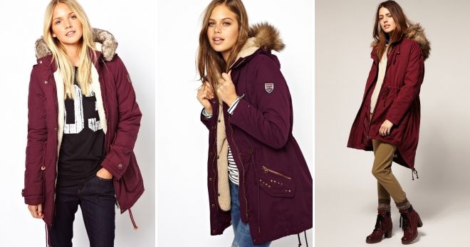 - Бордовые курки-парки – стильный и теплый повседневный вариант.
