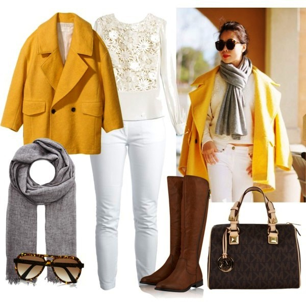 Если вы не знаете, с чем носят горчичные брюки, обратите внимание на верх белого, зленого или серого цвета. Такой ансамбль получается эффектным и сдержанным. Он подходит практически для любого случая.