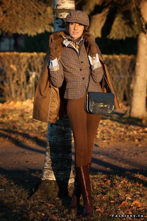 Для прогулок по городу редингот можно заменить уютным кардиганом. Вместо строгих классических брюк надеть узкие светлые лосины, к которым идеально подойдут высокие сапоги. Дополнительные аксессуары: перчатки, широкий ремень. Интересный вариант комбинирования приталенного жакета и платья. Только в этом случае обувь не должна быть на плоской подошве, вполне подойдут туфли на каблуке или сапоги.
