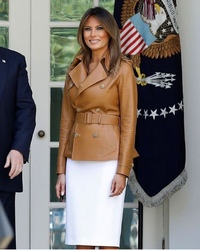 Для первого выхода в Иерусалиме Мелания предпочла белый костюм из коллекции Michael Kors, состоящий из жакета с широким поясом (997 долларов) и юбки.