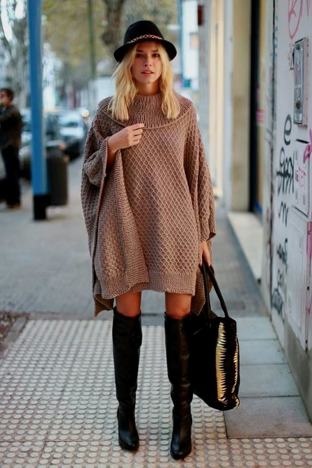 - Длинный и объемный кардиган можно сочетать с мини-платьем простого кроя и ботфортами из мягкой кожи или замши на плоской подошве.