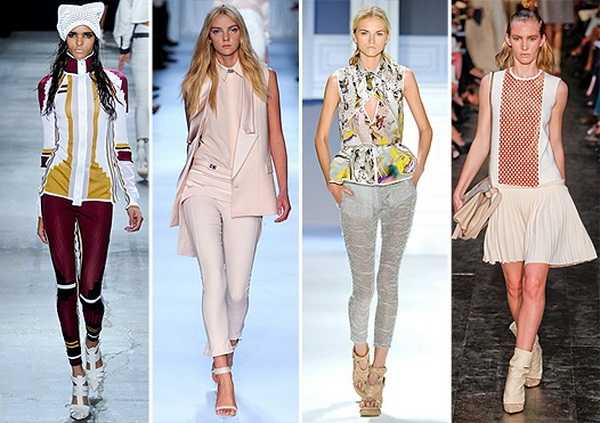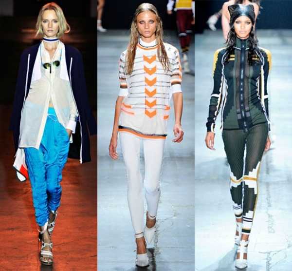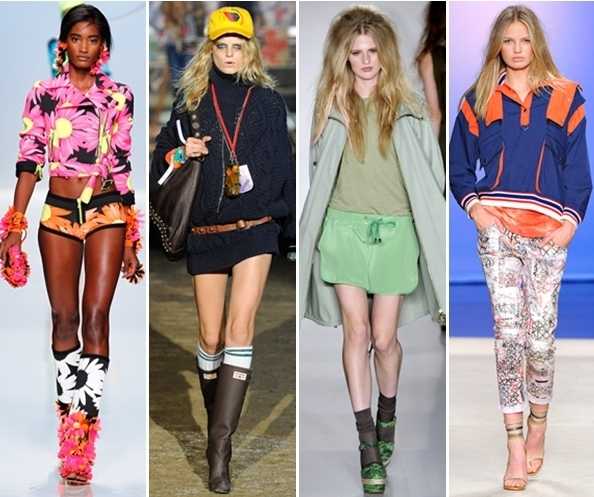 В восьмидесятые культ женской аэробики сделал актуальными яркие, кислотных расцветок лосины, гетры, боди из лайкры, широкие пояса. 90-е — эпоха R`n`B, широкие брюки с лампасами и спортивные костюмы размера oversize на пике моды. Новый век и мода на фитнес вдохнули свежую струю: спорт-шик не сходит со страниц журналов и фото в модных блогах.